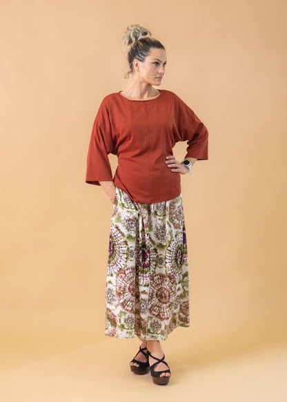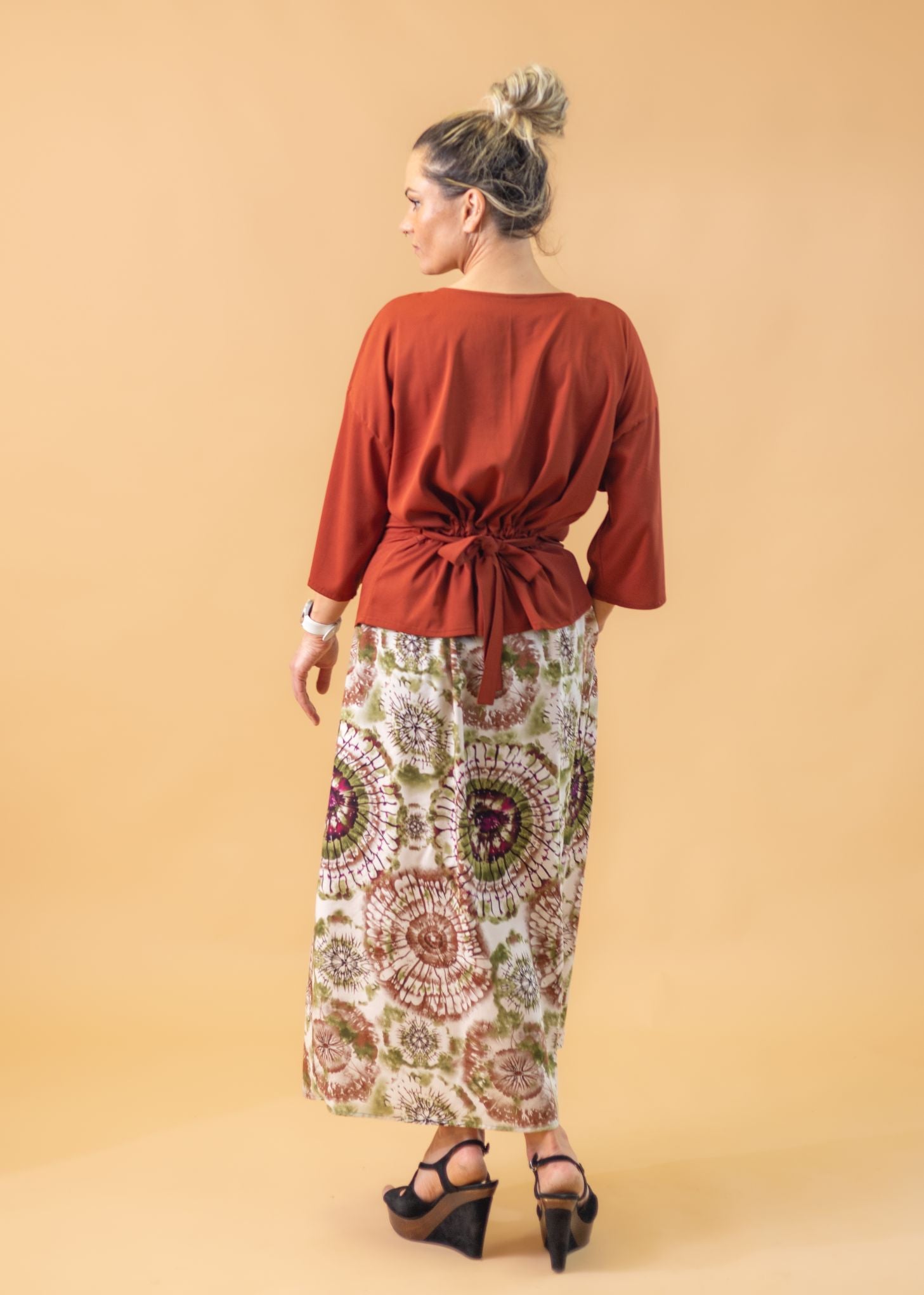 Pluus on avara lõikega, poolpikkade varrukatega. Seljal on vöö, mis hoiab pluusi kenasti vormis.